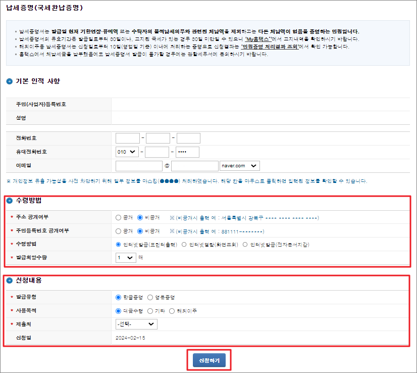 국세납세증명서 발급 시 유의사항
